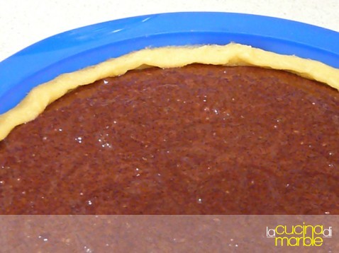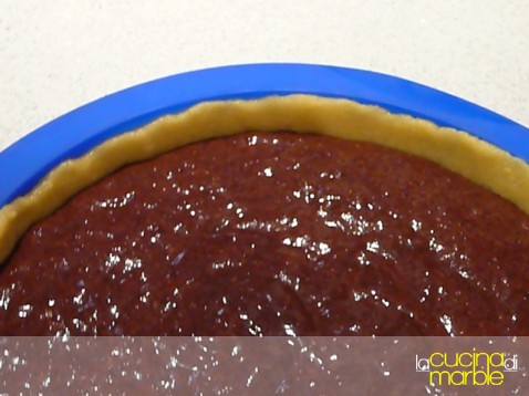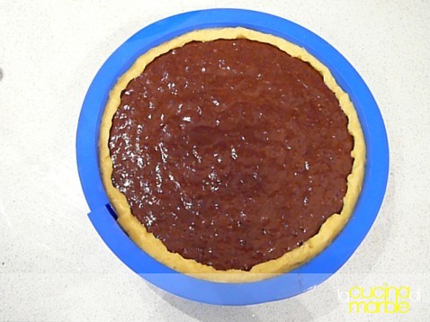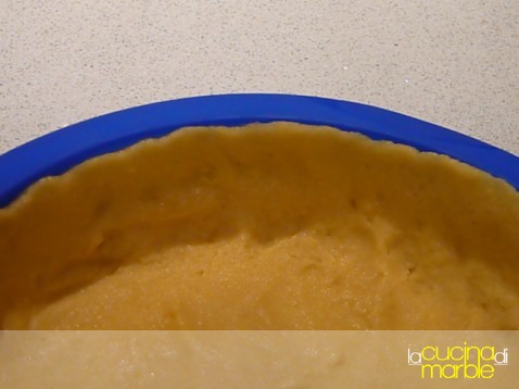 rivestire una teglia da 24 cm di diametro con l'impasto di base (risulta difficile tirarlo con il mattarello, tirarlo solo in parte e aiutarsi poi manualmente a rivestire la teglia)